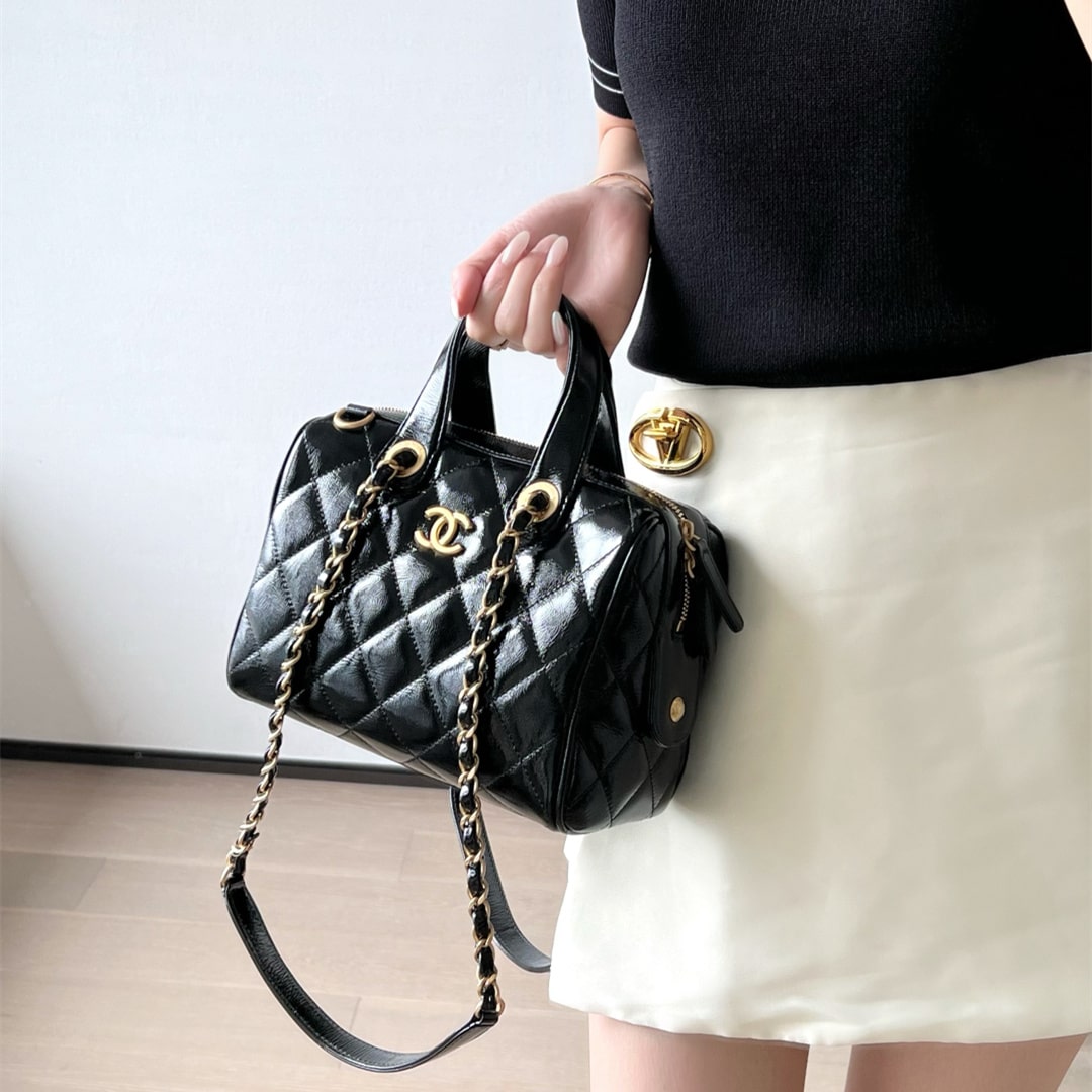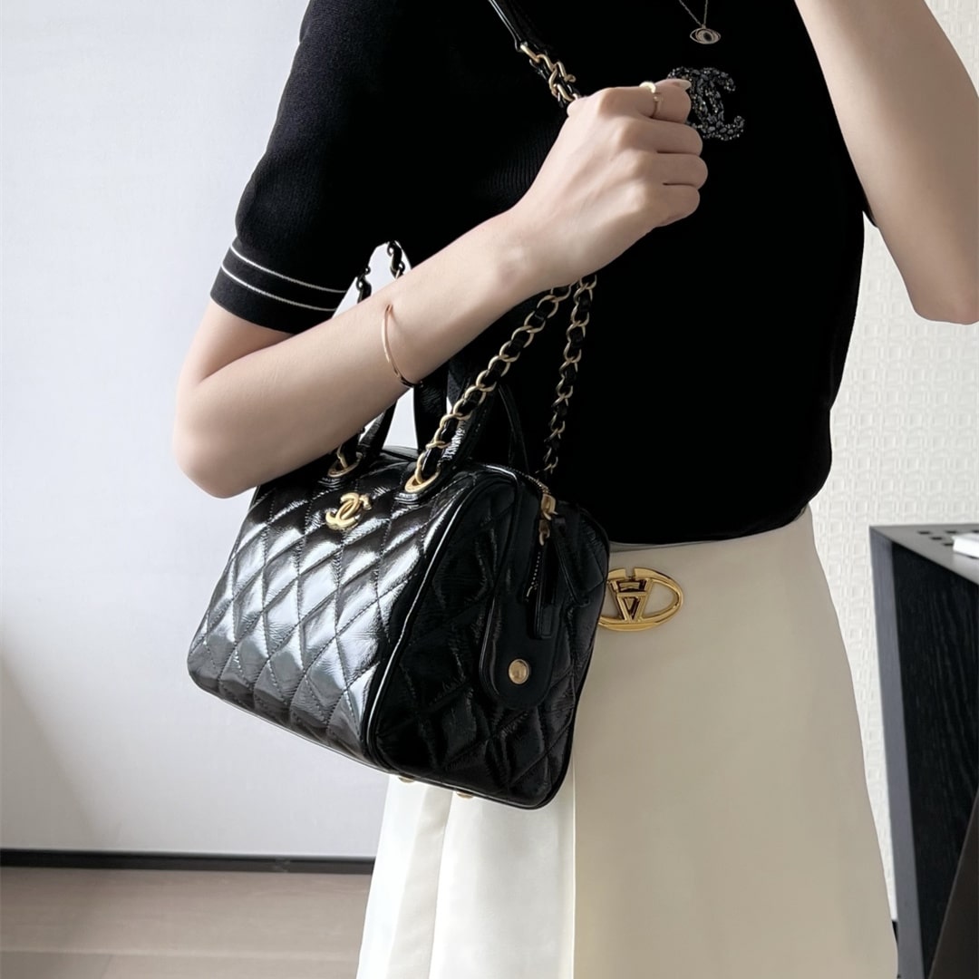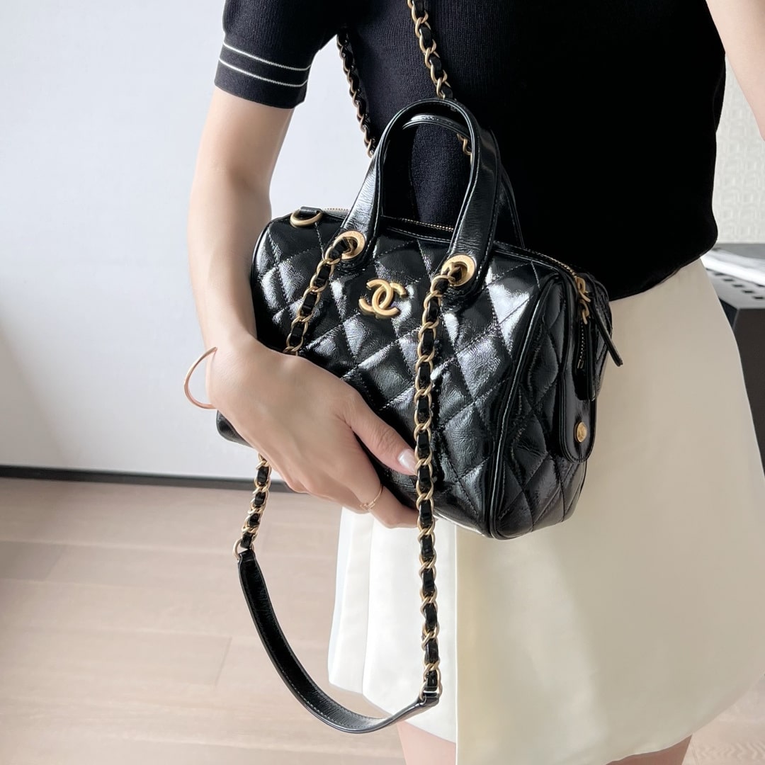 全新到貨高仿Chanel*25A系列手工坊油蠟皮保齡球包小號黑色.油蠟皮保齡球包承包一整個季節的優雅直接把「𝟫𝟢年代巴黎大小姐」氛圍感拉滿.亮光皮上泛著溫潤光澤.連走路都帶風.通勤逛街切換無壓力!復古回潮這局穩贏.