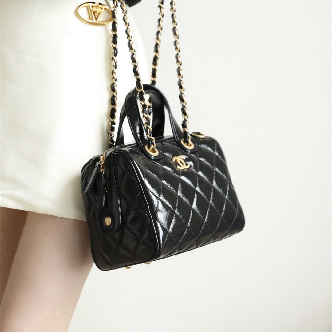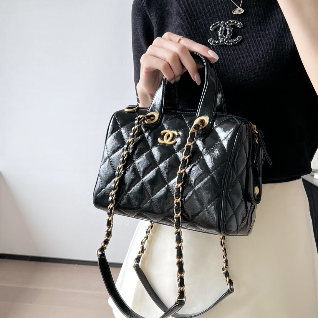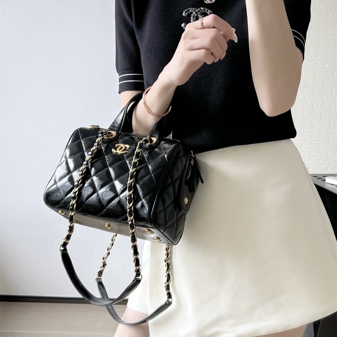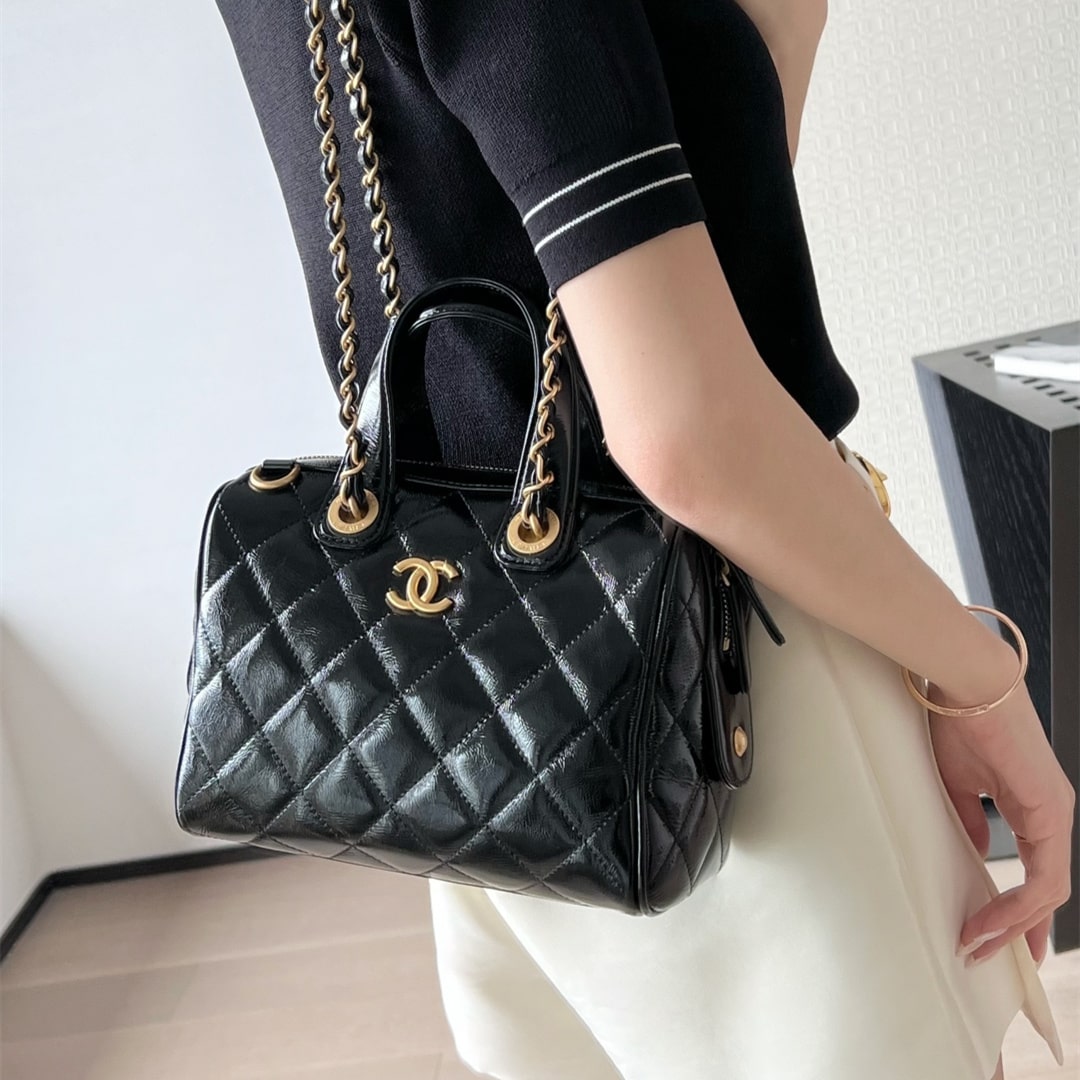 全新到貨高仿Chanel*25A系列手工坊油蠟皮保齡球包小號黑色.油蠟皮保齡球包承包一整個季節的優雅直接把「𝟫𝟢年代巴黎大小姐」氛圍感拉滿.亮光皮上泛著溫潤光澤.連走路都帶風.通勤逛街切換無壓力!復古回潮這局穩贏.