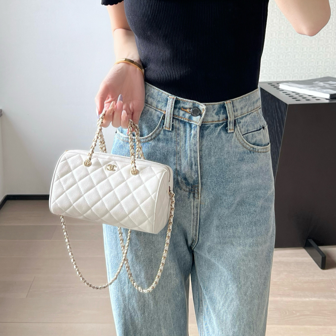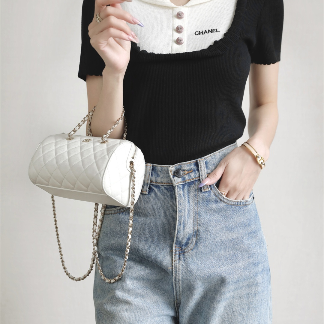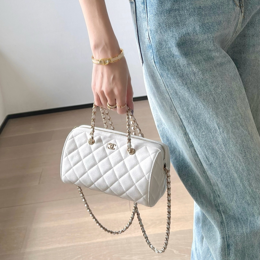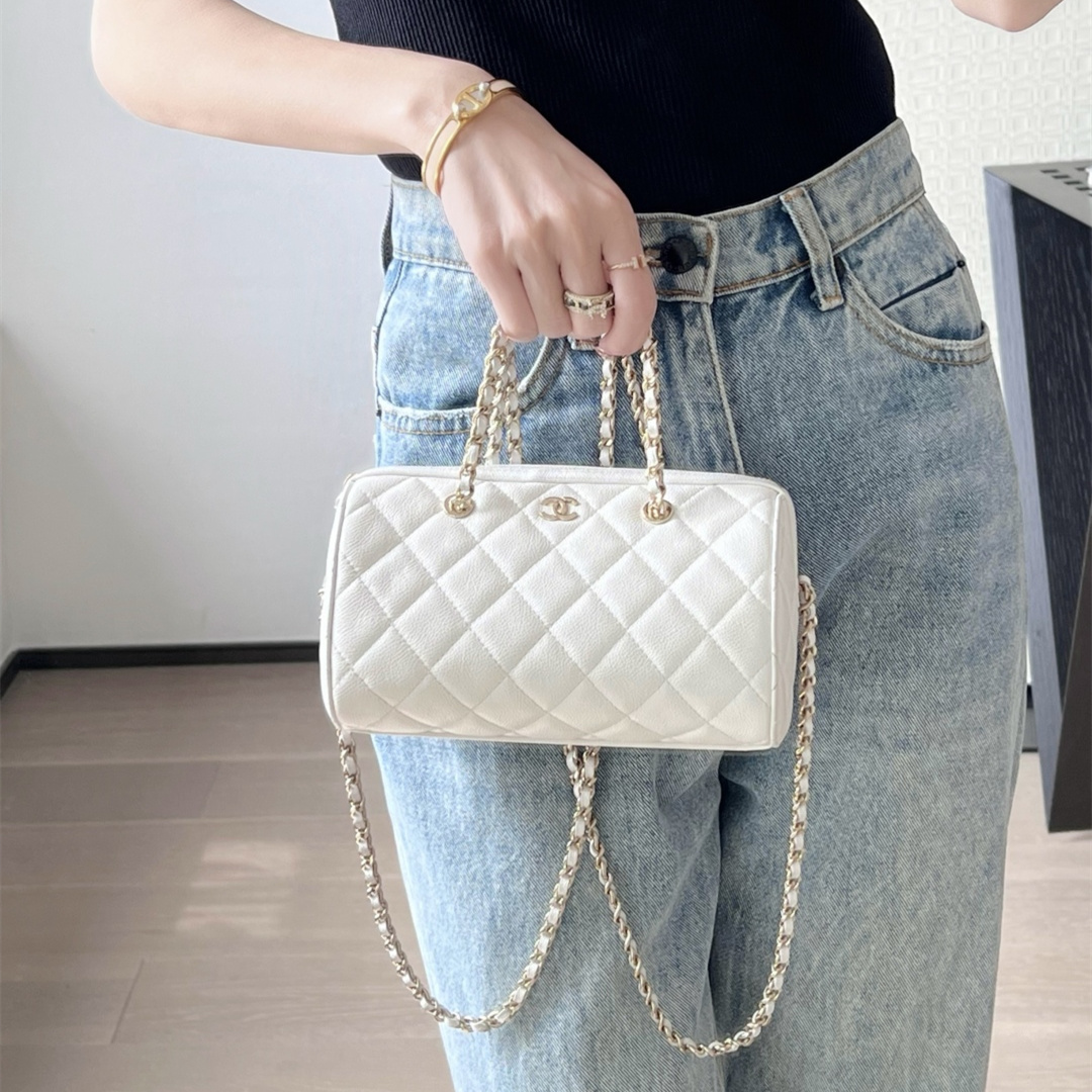 高仿Chanel*25P系列4385荔枝紋牛皮單肩包白色小號免檢版