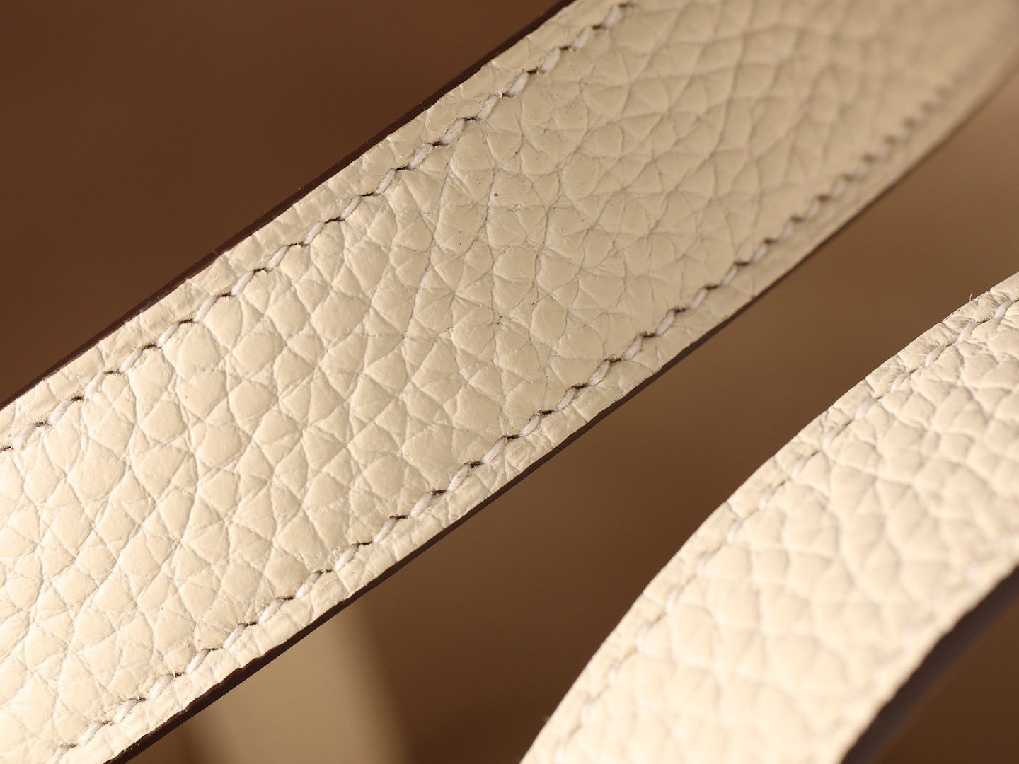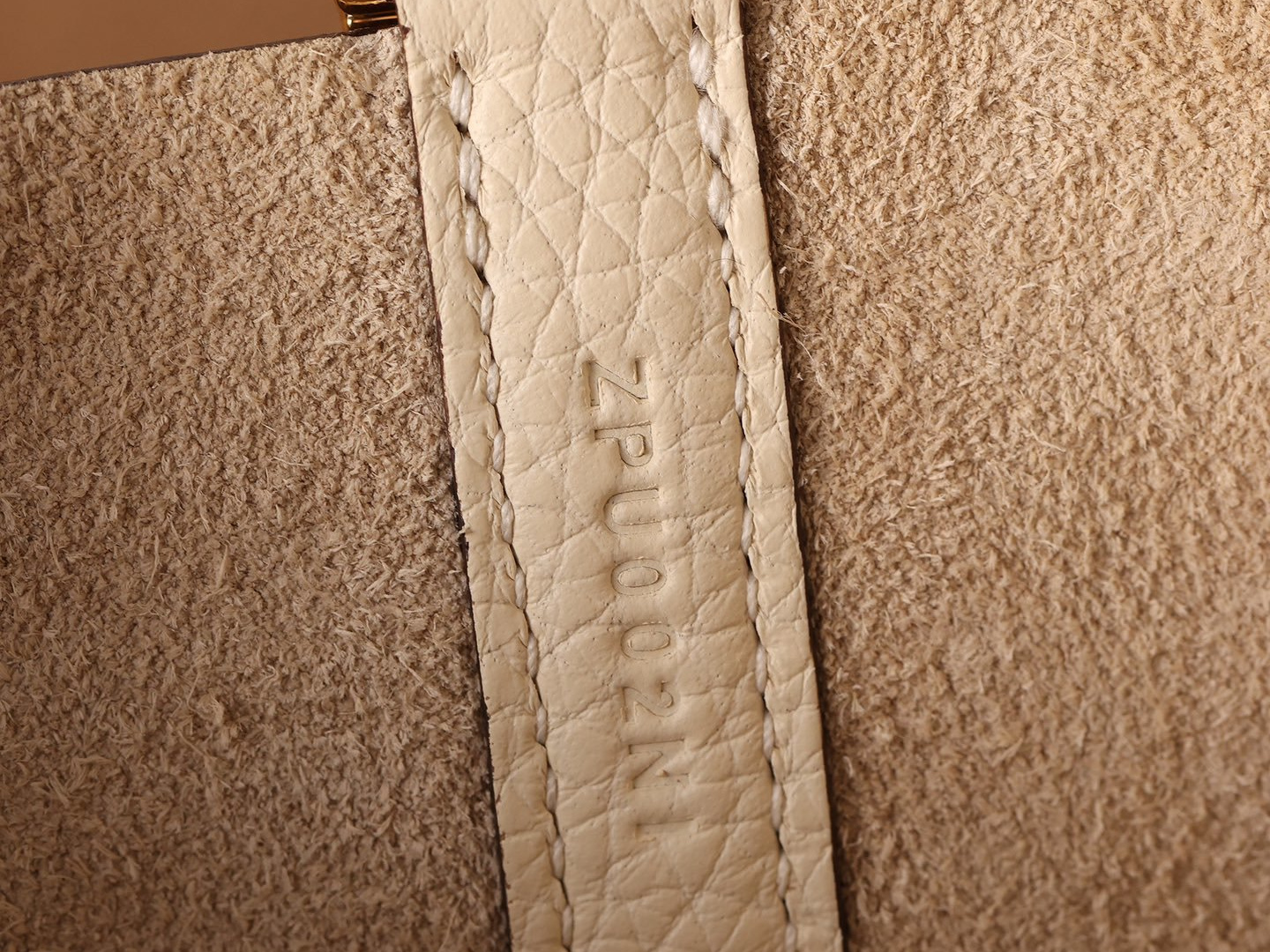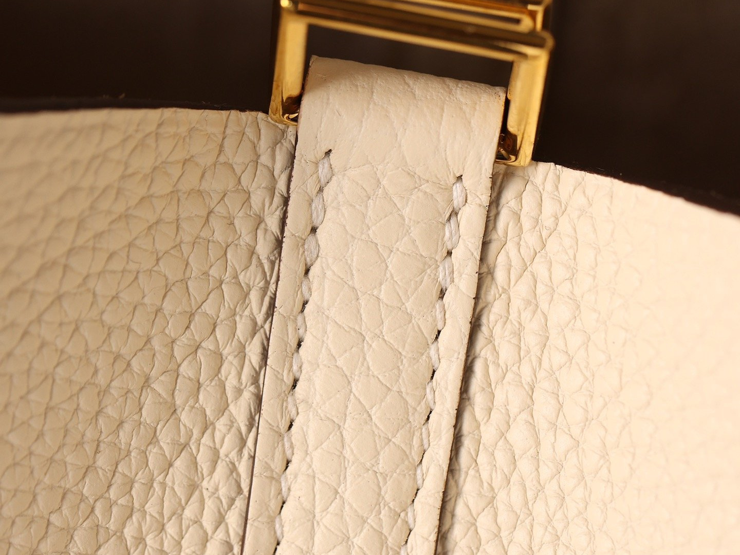 在高仿奢侈品市場中HermesPicotinLock系列的奶昔白水桶包是一款引人註目的作品.這款原單Hermes水桶包采用了與原版Hermes相同的TaurillonClemence(TC)皮革.這種皮革是從成年公牛的頸部精選而來.使其具有獨特的大而平坦的顆粒紋理.TC皮與Hermes中常見的Togo皮相比.雖然紋理和顆粒感截然不同.但手感更柔軟.能更好地保持包型.這款包包的唯一缺點是防水性不強.容易留下水印.因此在使用時需要更加小心呵護.