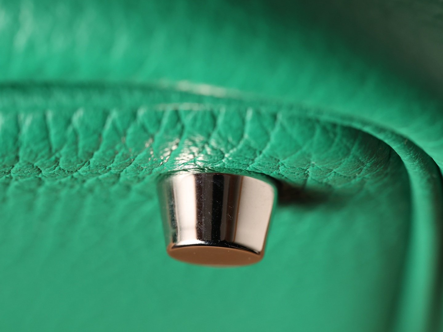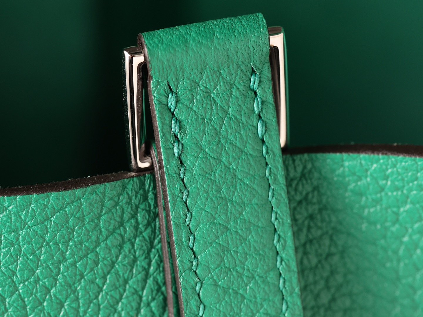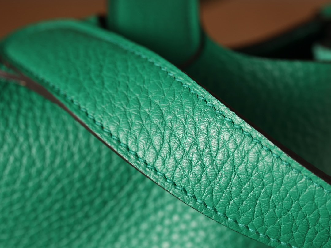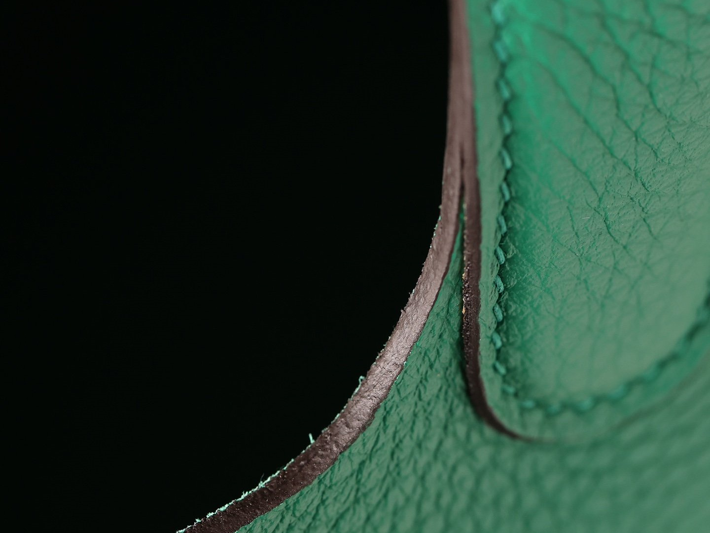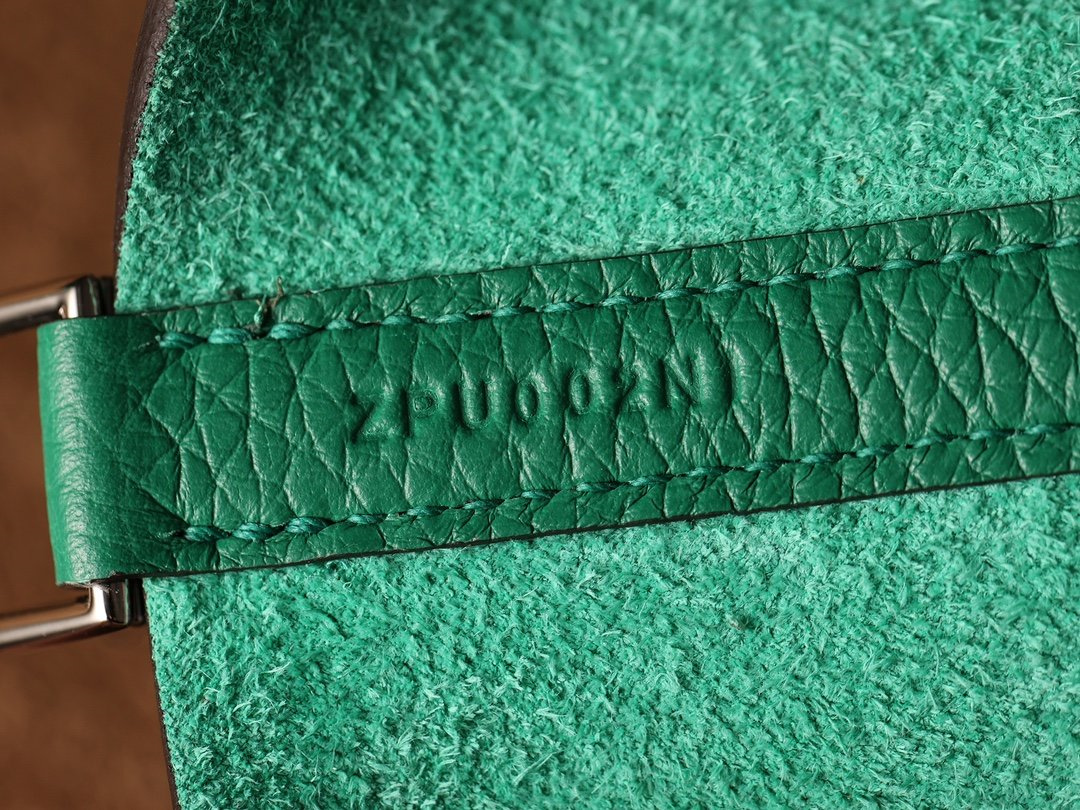 原單Hermes水桶包絲絨綠銀扣包包.展現了手工藝術的非凡魅力.不僅是一件實用的日用品.更是一件精湛工藝的藝術品.工匠們採用了傳統手工技術和現代設計理念的完美結合.每個細節都經過細心雕琢.體現出對品質和美學的極致追求.高仿包包的主材質為優質的TaurillonClemence皮革.俗稱TC皮.這種皮革選自成年公牛的頸部.質地堅韌而光滑.表面的顆粒紋路自然細膩.給人一種豐富的視覺和觸感體驗.這種高級皮革不僅有著出色的耐用性.更因其獨特的質感和光澤.成為高端奢侈品的首選材料.