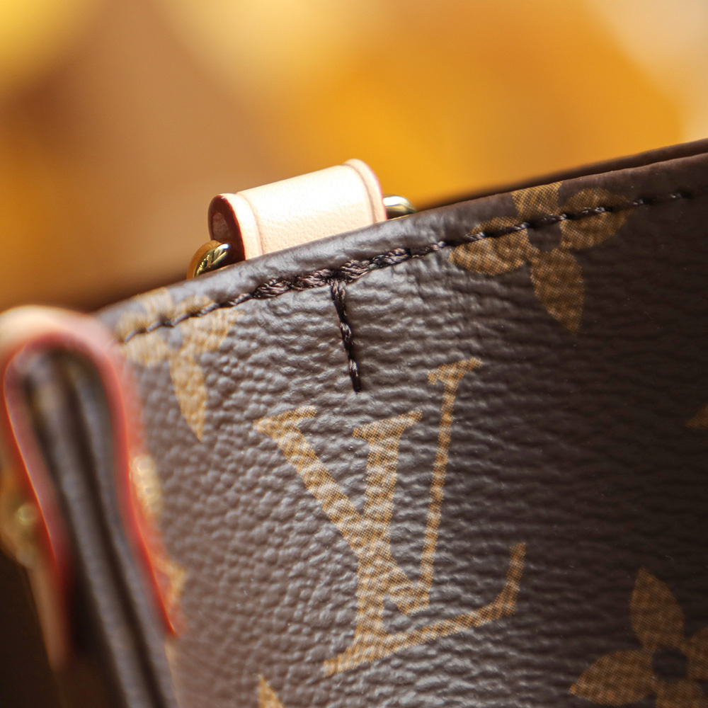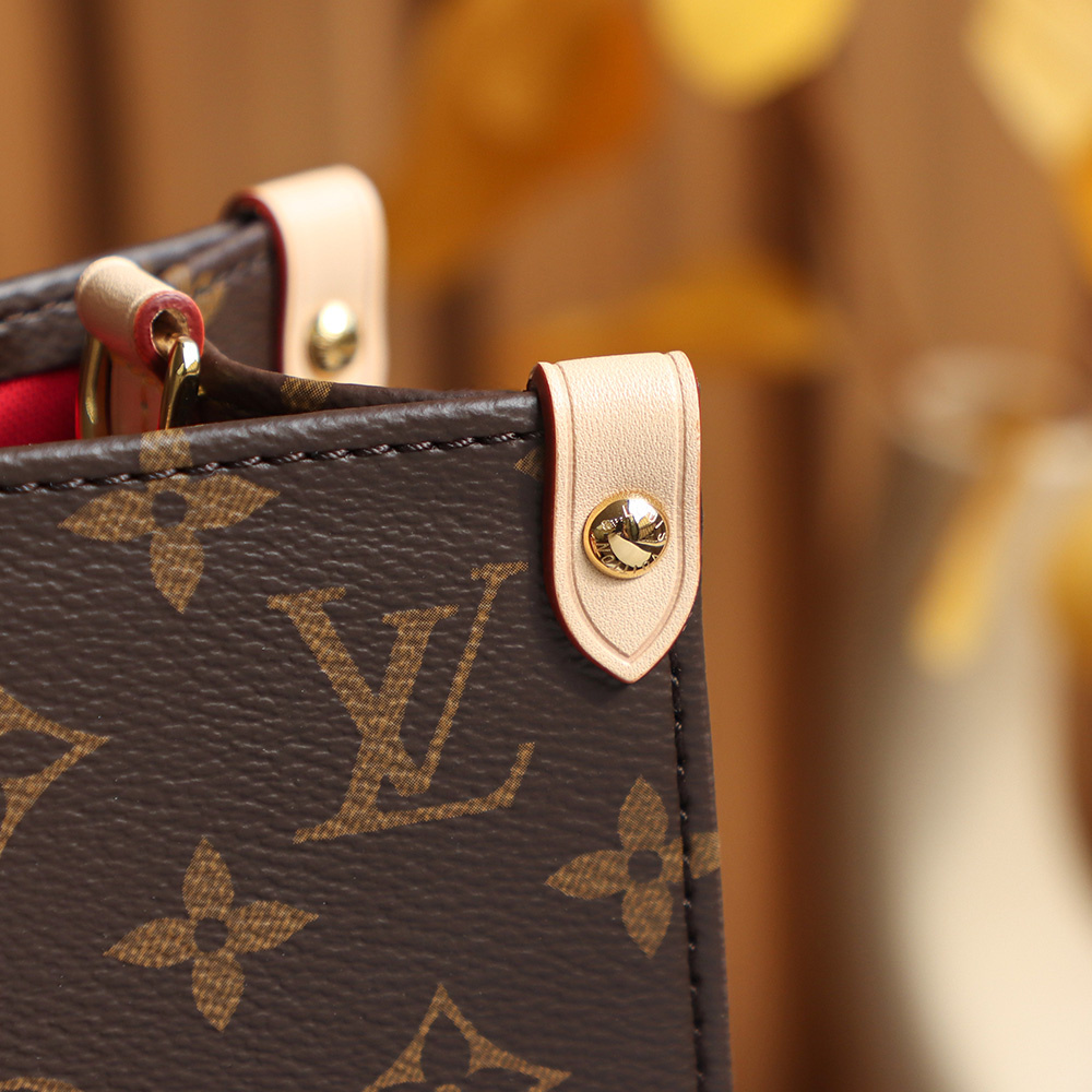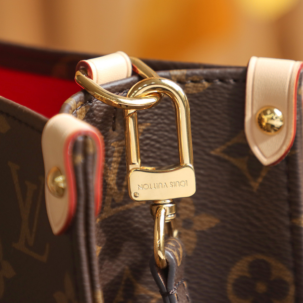 該款原單LV手提包使用了與專櫃相同品質的Monogram老花帆布.每一處對稱的印花都經過專業裁剪.確保包身展現的老花圖案與原版正品完全對稱.從底部到包口的長弧度裁剪.避免了拼接皮革的不對版問題.只有選用一整張高品質帆布.才能展現頂級工藝的LV包包.可區別市面上劣質版本使用的拼接工藝節省造價成本.